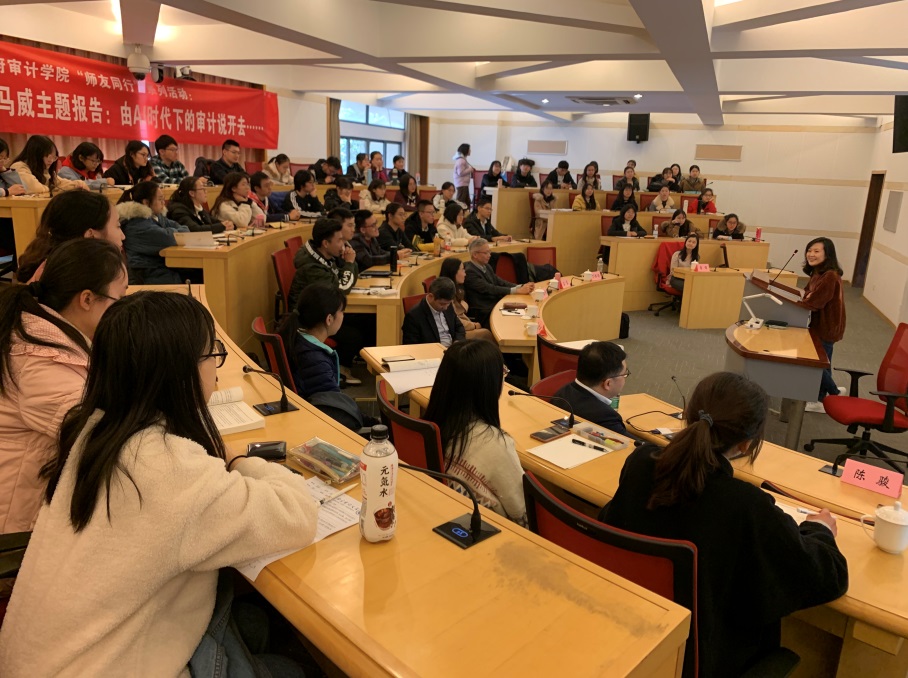 在陈骏院长简短的开场白后,高智纬先生表示时代的发展十分迅速,学生在学校学到的知识并不足以支撑去适应外面的世界,以前的审计方法放到现在的社会背景下并不适用,鼓励同学们紧跟时代的步伐并努力前行。苏星女士以自己的工作经历为例,向同学们描述了现代大数据背景下审计行业的发展现状,通过一个个生动具体的事例,同学们更加真切地感受到时代进步以及科技创新为审计技术方法带来的变革与创新。