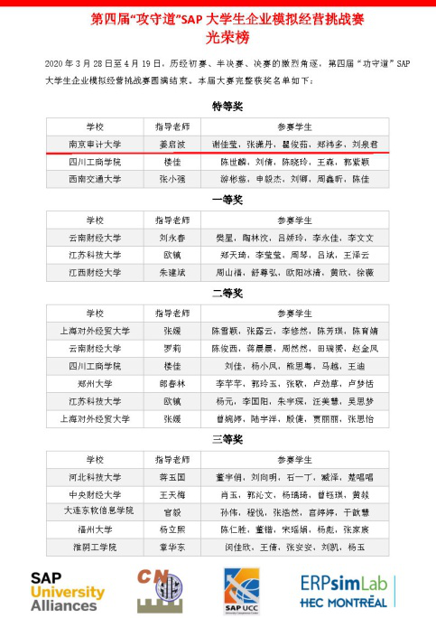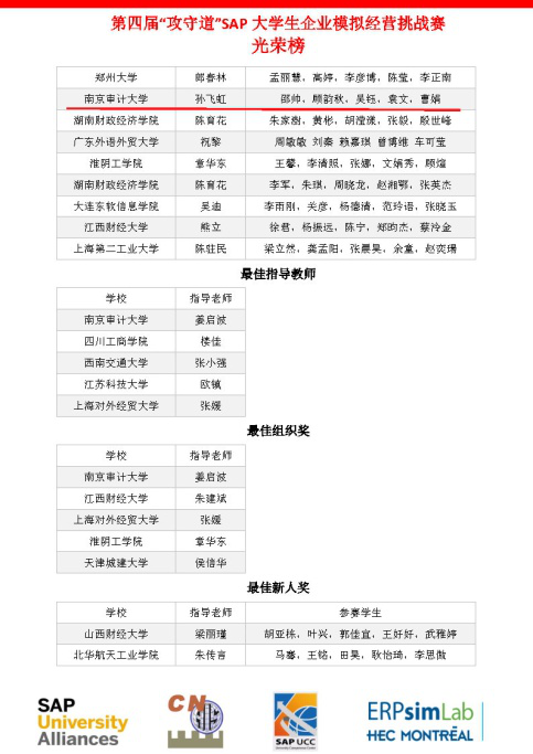 在刚刚落下帷幕的全国第四届“攻守道”SAP大学生企业模拟经营挑战赛中,由我院谢佳莹、张潇丹、翟俊茹、郑祎多和会计学院刘泉君五位同学组成的“谢广坤后援团”代表队,以及由我院曹娟和其他学院五位同学组成的“与你有瓜” 代表队分别荣获特等奖和三等奖。