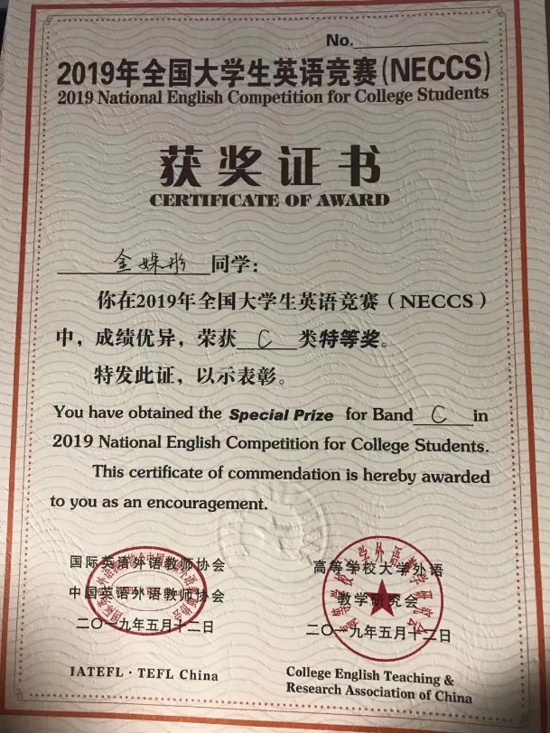 她还很喜欢英语,参加英语竞赛也获了奖。