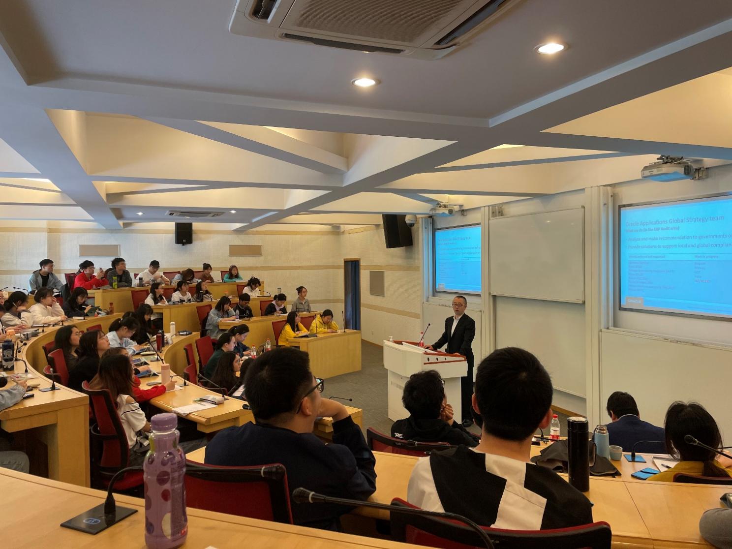 本次讲座由现甲骨文(中国)软件系统公司高级经理、全国审计信息化标准化技术委员会委员金纪文博士主讲,政府审计学院王士红副院长,陈希晖主任,巨敏老师以及大数据审计方向的学生出席,讲座由政府审计学院杨柔坚博士主持。