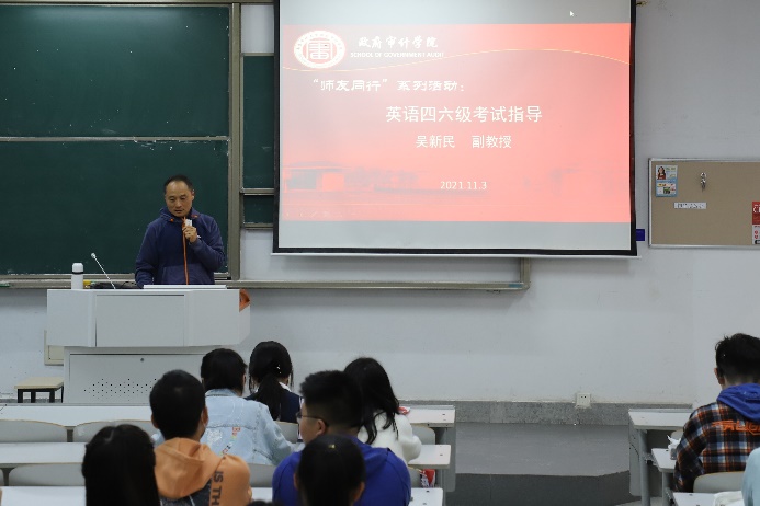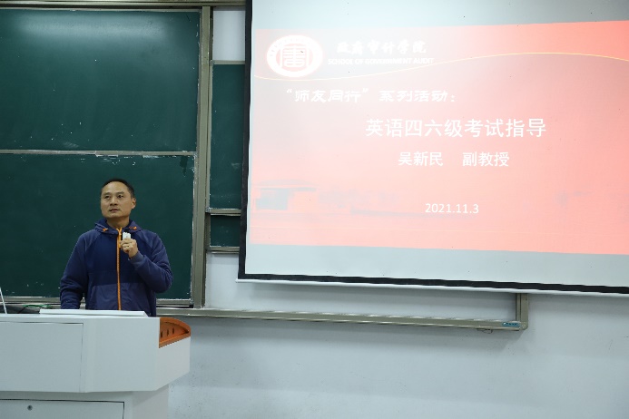 为帮助学生更好地备战四六级考试,提高英语水平, 113日,政府审计学院特邀请外国语学院吴新民副教授在竞秀楼N107为同学们开展一场关于英语四六级作文备考策略讲座。