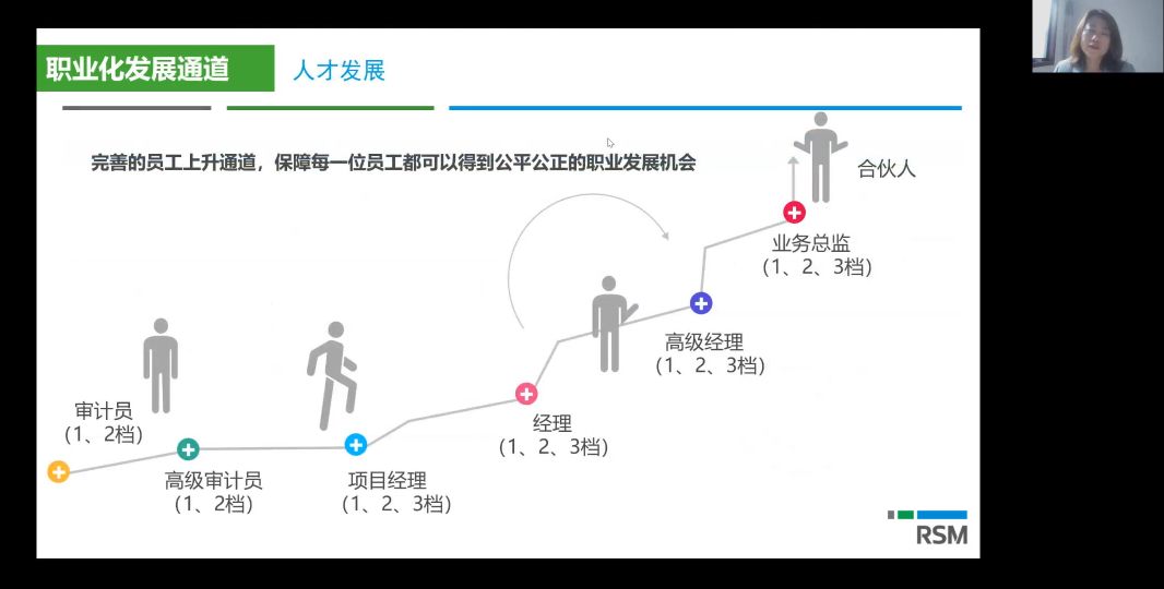 关于人才发展的路径,刘瑞平介绍了会计师事务所审计人员七档发展,从普通审计员到合伙人,完善的员工上升通道,保障每一位员工都可以得到公平公正的职业发展机会。