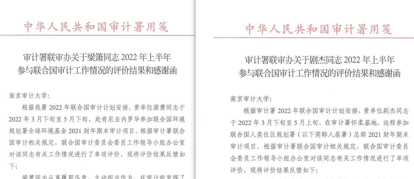 近日,学院收到来自审计署联审办的感谢信,对学院剧杰、梁箫老师参与2022年上半年联合国审计工作表示感谢。信中对两位老师的敬业态度、专业素养以及工作能力表示充分肯定。他们圆满完成了此次联合国审计任务,充分发挥了一名共产党员的先锋模范作用,在联合国审计舞台上展示了中国审计人专业敬业的良好风貌。