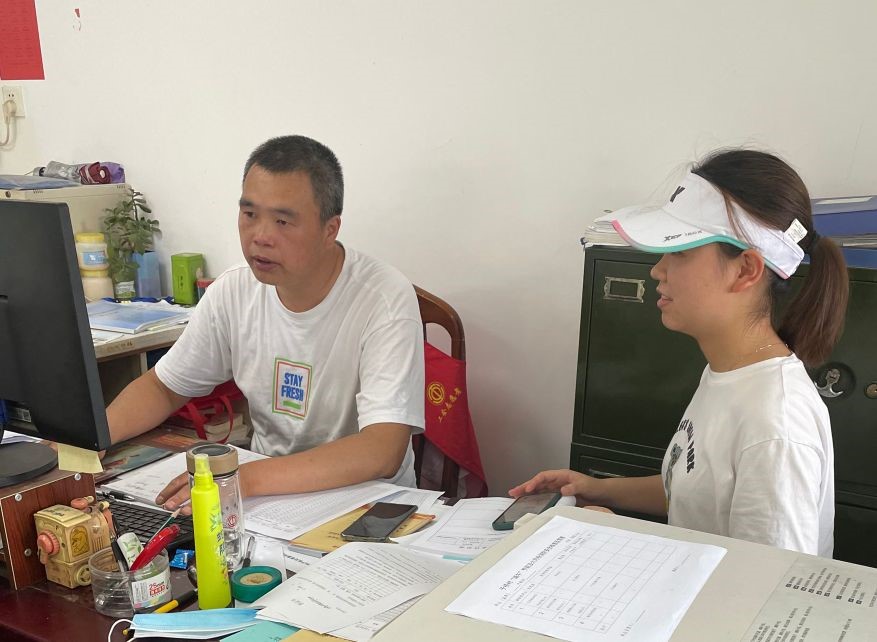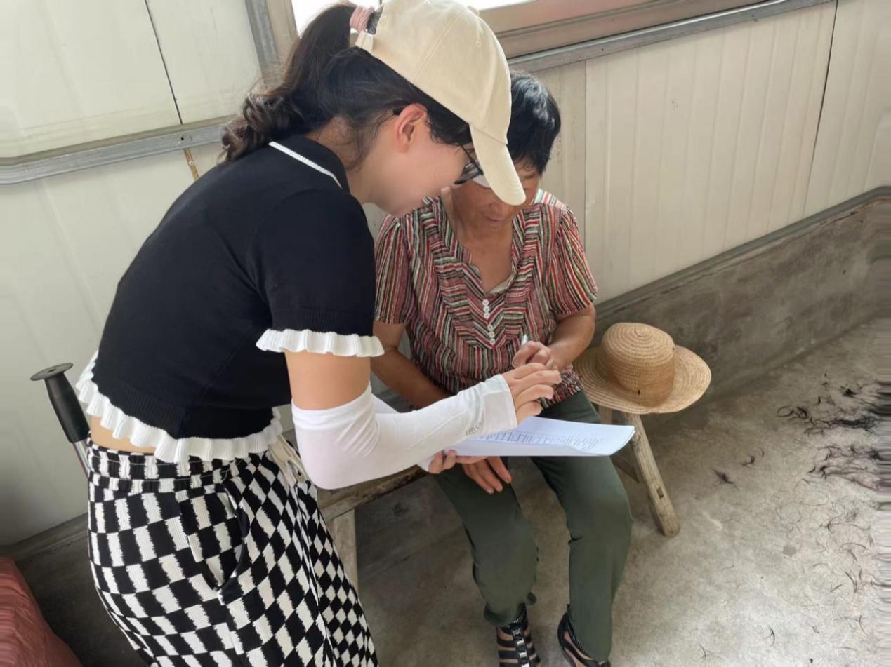 结束党群服务中心的访谈,南通小分队的队员们入户采访村民并指导他们填写调查问卷。初入农户,村民爷爷奶奶们便端上茶水给队员们消暑,让队员们深刻感受到了当地村民之热情、民风之淳朴。由于村里老人较多,村民们的受教育程度不是很高,因此问卷的大部分内容都是队员们以口头的形式表述给村民,同时队员们还需要对一些专业化名词作出通俗易懂的解释。村民们也都不厌其烦,积极配合队员们的问卷调查。有位奶奶说道:“这么多年来,我们的生活条件得到了极大改善的同时,村委会的各项工作也更加公开透明。不仅村组织架构很清晰,而且各村都有网格员,我们反馈的问题都能得到及时有效的解决。”说到这里,奶奶脸上不禁洋溢着笑容,脸上的皱纹也笑成了一朵花。