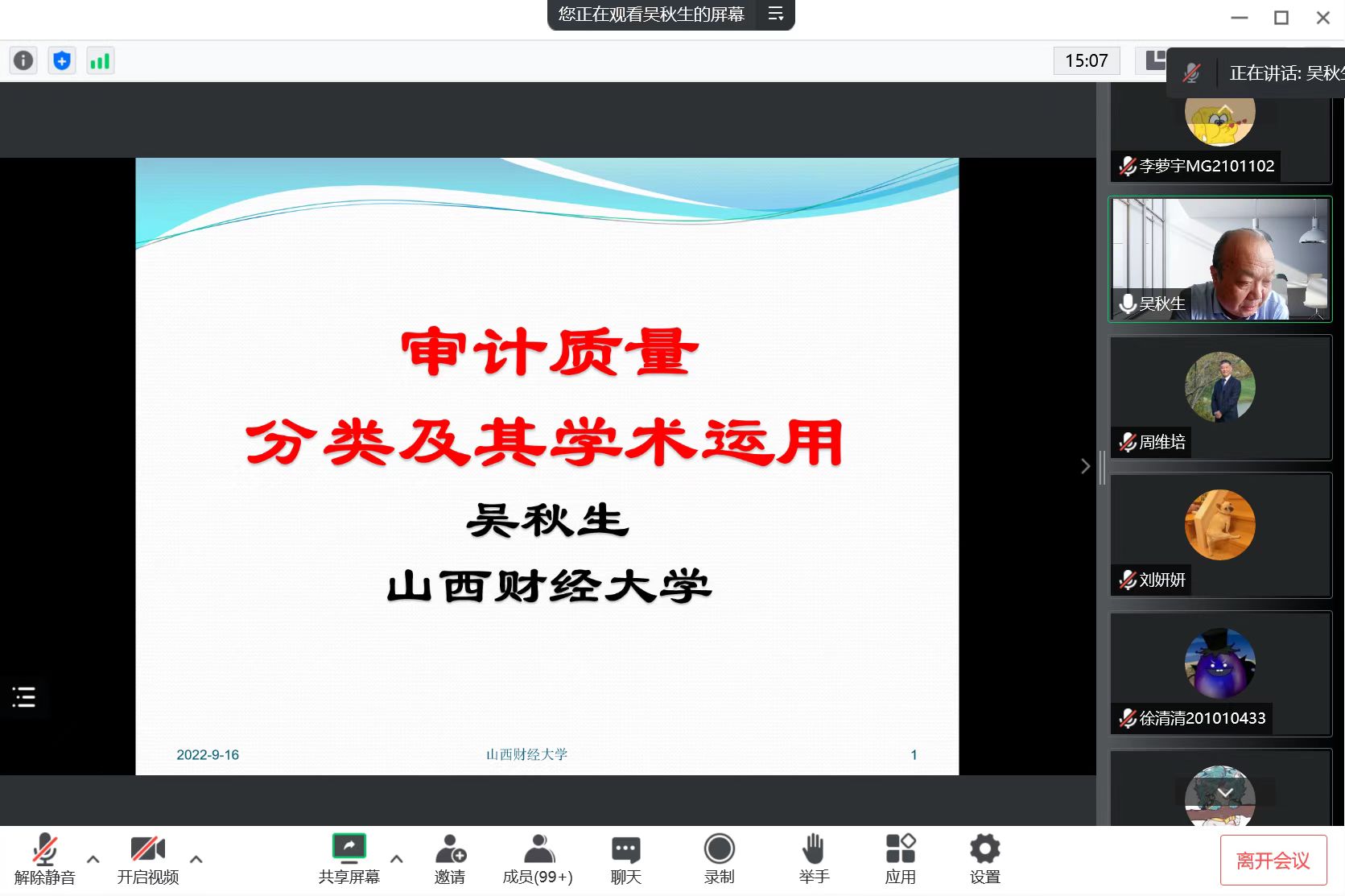 916日下午,政府审计学院在线上举办第133期 “审计名家讲坛”,邀请山西财经大学吴秋生教授作主题为“审计质量分类及其学术运用”的学术讲座。政府审计学院院长周维培教授主持讲座,200余位师生聆听了此次讲座。