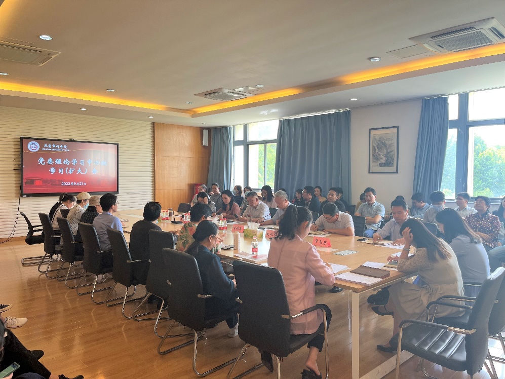 9月21日下午,政府审计学院在敏行四楼会议室召开党委理论学习中心组学习(扩大)会。全体教职工参加学习。学习会由学院党委书记童瑞连主持。
