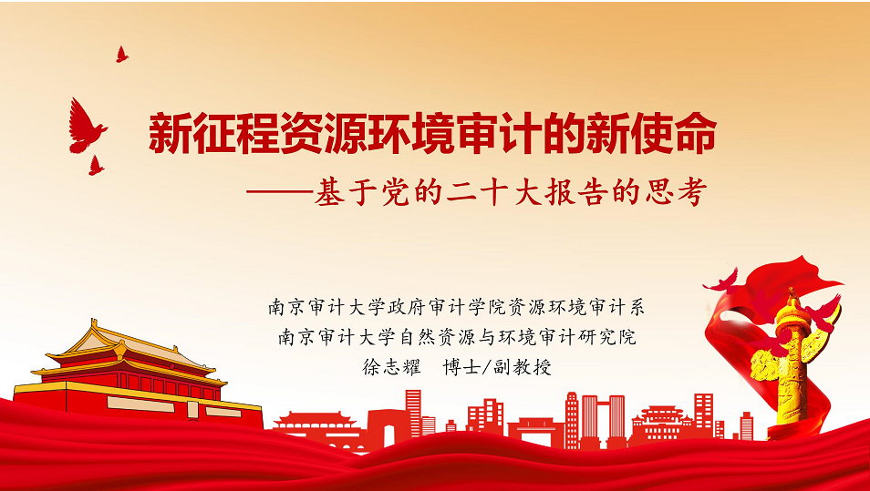 基于对党的二十大报告的思考,徐老师从资源环境审计使命的演进过程、党的二十大报告赋予资源环境审计的新使命、面向新使命的资源环境审计工作要务这三个流程展开本次讲座。