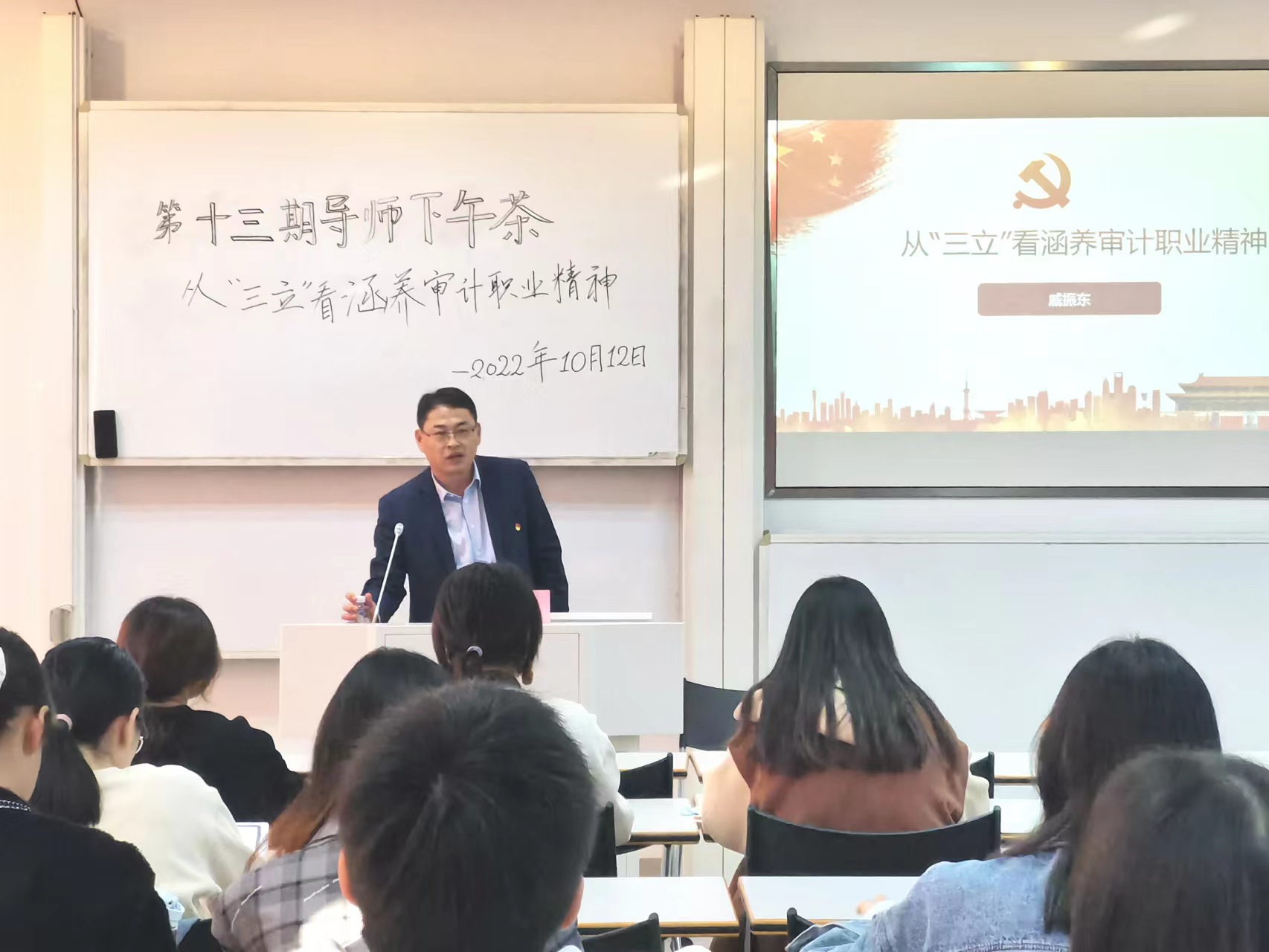 10月12日下午,由政府审计学院研究生会举办的第十三期“政审导师下午茶”之“从‘三立’看涵养审计职业精神”分享交流会在敏行313举行。此次活动邀请到政府审计学院戚振东教授作为主讲嘉宾。