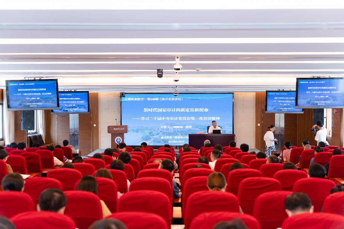 为深入学习和理解二十届中央审计委员会第一次会议精神,6月8日下午,政府审计学院党委和机关党委开展主题教育集中联学活动暨第138期《审计名家讲坛》学术讲座。政府审计学院院长周维培教授以《新时代国家审计的新定位新使命——学习二十届中央审计委员会第一次会议精神》为题作讲座。机关全体中层干部、科级干部,政府审计学院全体教职工、研究生代表参加本次活动。讲座由政府审计学院党委书记李海燕主持。